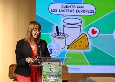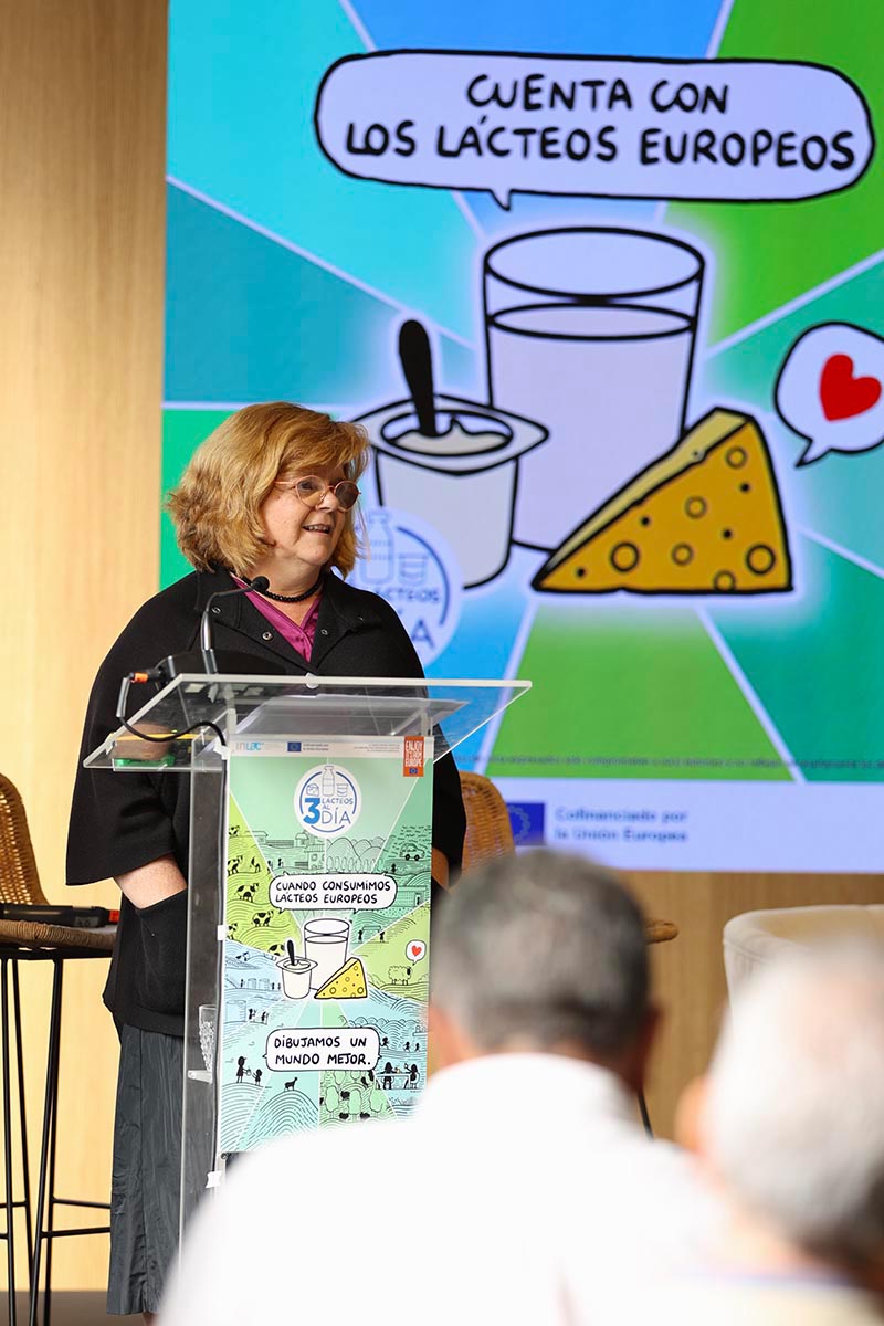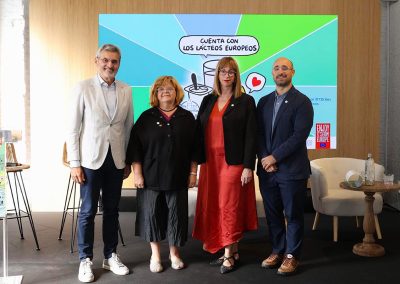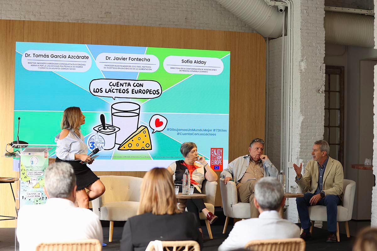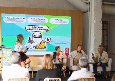 Posteriormente, tuvo lugar la mesa redonda “Retos y oportunidades: lácteos saludables frente al reto de la sostenibilidad medioambiental”, con la intervención de expertos como Dr. Javier Fontecha, Profesor de Investigación del CSIC en el Instituto de Investigación en Ciencias de la Alimentación (CIAL-CSIC/UAM), Tomás García-Azcárate, Doctor ingeniero agrónomo especialista en Economía Agraria por la Universidad Politécnica de Madrid y experto en asuntos comunitarios, y Sofía Alday, directora de la Confederación de Asociaciones de Frisona Española (CONAFE).